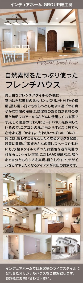 真っ白なフレンチスタイルが魅力のO様邸。塗壁と無垢フロアーが生む自然素材の心地よさ。ヌックや造作洗面など、癒しと可愛らしさが詰まった住まいです。